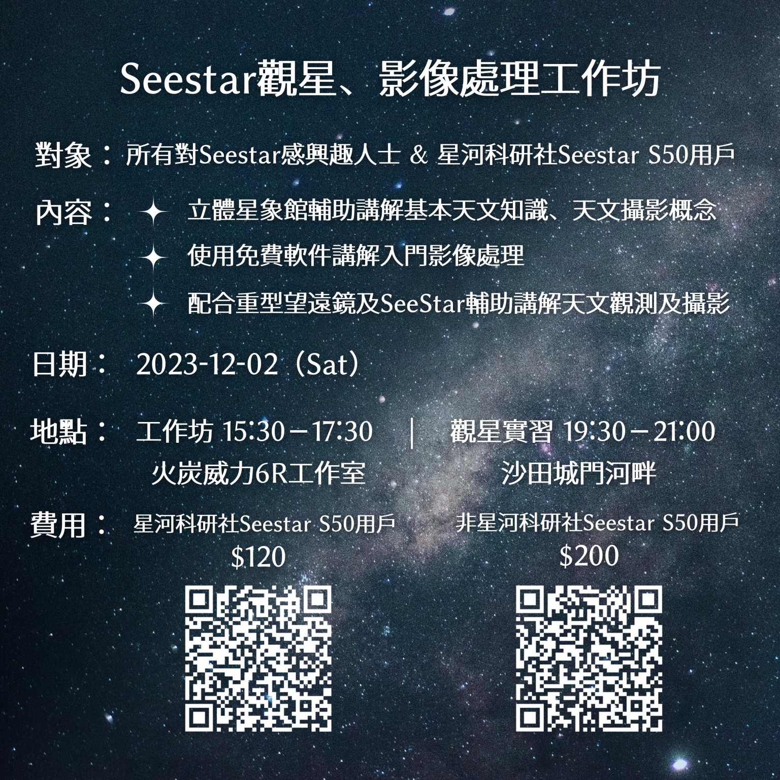 費用: - 星河科研社SeeStar用戶 每位$120
